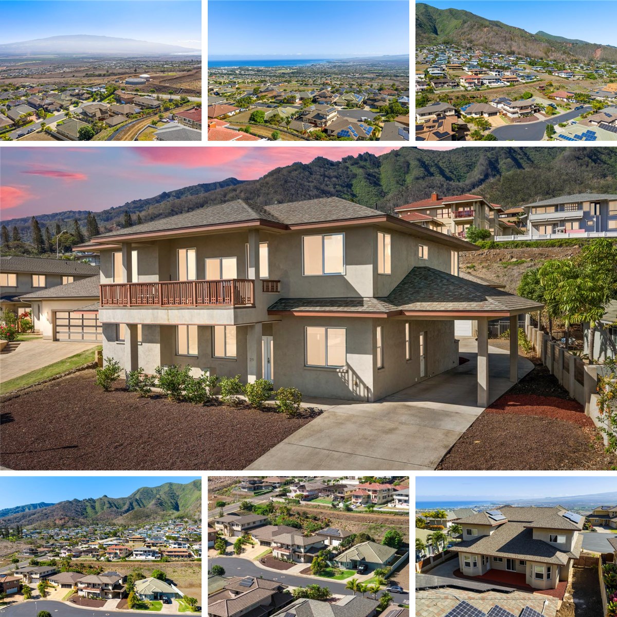 Situated on a quiet cul-de-sac within the gated community of Koa at Kehalani, this impressive two-story stucco residence offers an exceptional blend of space, comfort, and island elegance. The property is energy efficient with an owned 32 panel net metered photovoltaic system and solar hot water system bringing the average electricity cost to $32/month for the current owners. Encompassing 3,294 square feet of living area, the home features five bedrooms and four and a half baths, highlighted by soaring vaulted ceilings and thoughtful architectural details throughout. Enter through striking glass double entry doors into a main level designed for both everyday living and elegant gatherings. This level includes a great room, formal living room, formal dining room, breakfast nook, and a beautifully appointed kitchen with granite countertops, stainless steel appliances, and rich wood cabinetry. The kitchen is enhanced by a corner sink framed by mitered glass windows. A convenient laundry room with matching cabinetry and a laundry sink is located just off the kitchen, along with an additional half bath for guests. The spacious first-floor primary suite is a private retreat, featuring a sitting area with a bay window, direct access to a covered lanai, and a luxurious en-suite bath with a large walk-in closet, jetted tub, separate shower, enclosed toilet room, and dual vanities with vessel sinks. The lower lanai provides an inviting setting for relaxing or entertaining in the island breeze. Upstairs, you will find four bedrooms and three full baths, including one bedroom with an en-suite bath and two bedrooms connected by a Jack-and-Jill bath. A versatile loft area opens to a spacious, tiled covered lanai, offering the perfect vantage point to enjoy stunning Haleakala and ocean views. Additional features include a porte cochère, fenced back and side yards, and an expansive 880-square-foot detached four-car garage with its own half bath. This exceptional home combines generous living spaces, quality finishes, and beautiful island views in one of Kehalani’s most desirable gated neighborhoods.